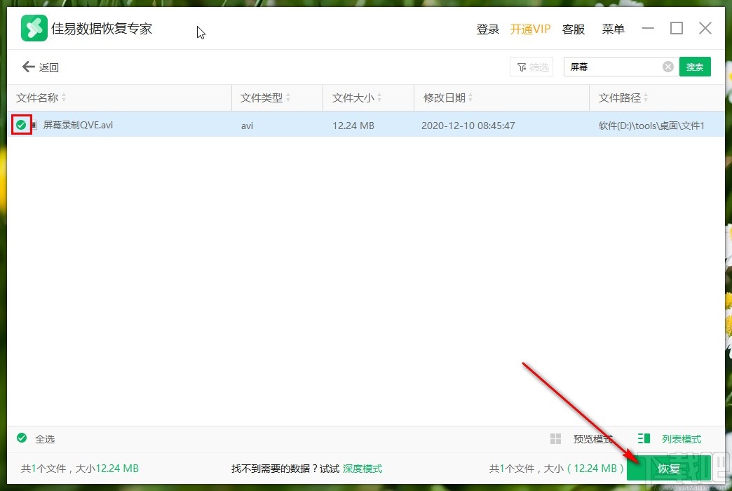 6.最后用关键词搜索到相匹配的文件之后,勾选文件左边的圆圈,勾选之后点击右下角的恢复按钮即可开始恢复这个文件的操作。