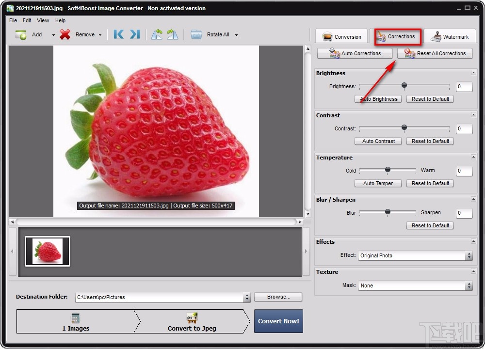 3.将图片添加到软件后,我们在界面右上方找到“Corrections”选项,点击该选项再进行下一步操作。