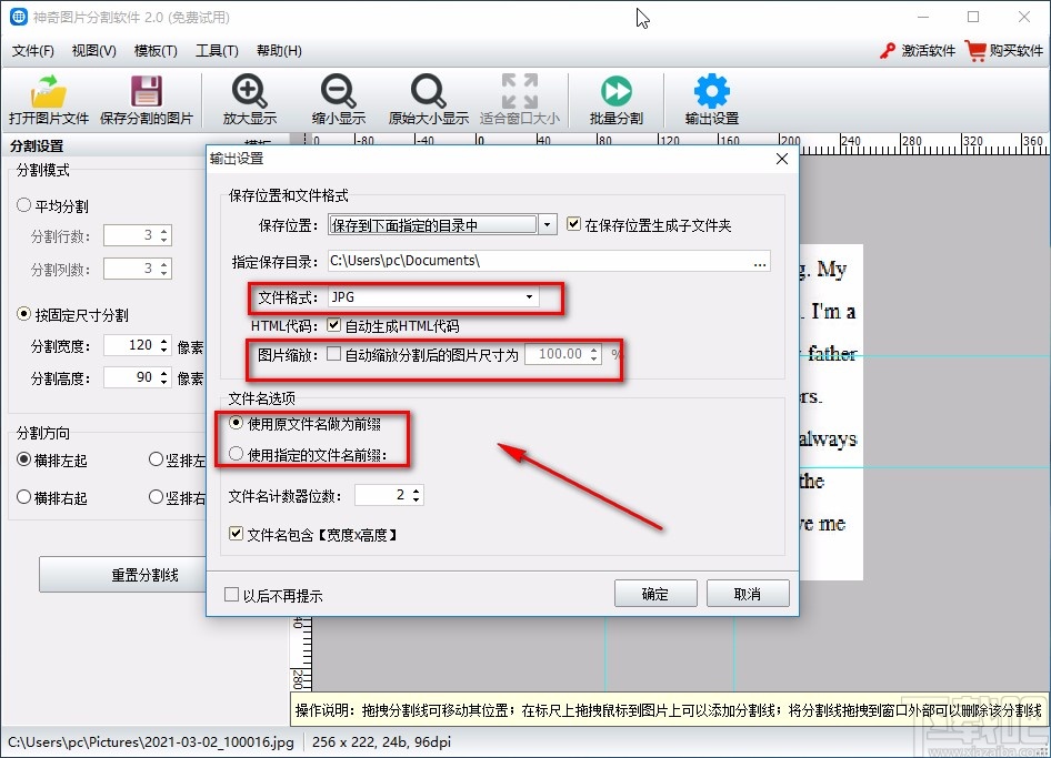 4.如果选择“按固定尺寸分割”选项,则在其下方的“分割宽度”和“分割高度”文本框中输入对应的数值。