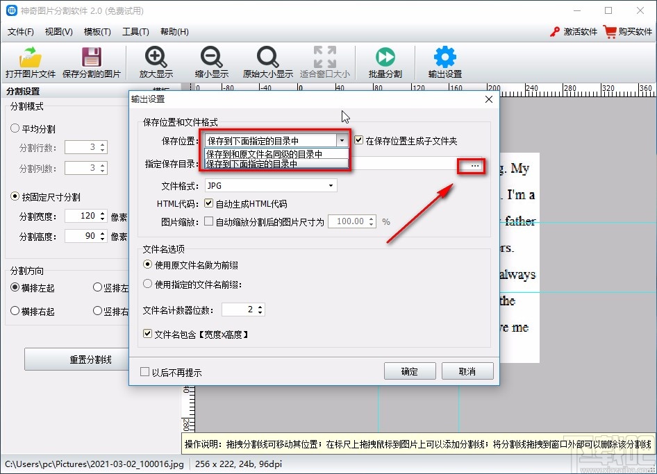 6.接下来在界面左上方找到“保存分割的图片”按钮,我们点击该按钮,界面上就会出现一个输出设置窗口。