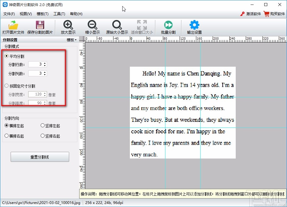 3.将图片文件添加到软件后,我们在界面左侧可以看到两种分割模式,根据自己的需要进行选择;如果选择“平均分割”,则需要在其下方设置分割行数以及分割列数。