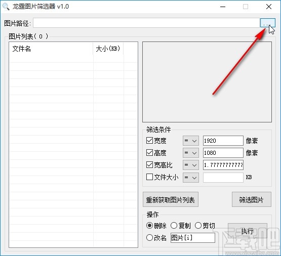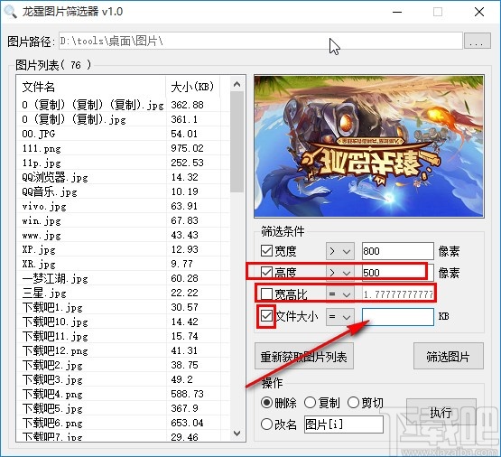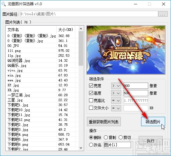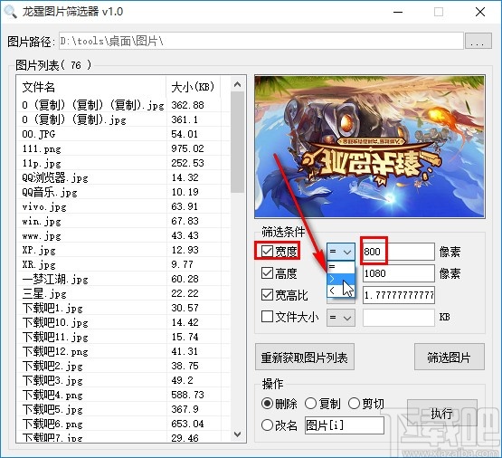 3.点击这个确定按钮之后在界面中可以看到图片文件夹中读取出来的一些图片文件,然后在右边勾选筛选条件,设置好像素参数之后,选择想要筛选的图片是大于、小于还是等于设置的参数值。