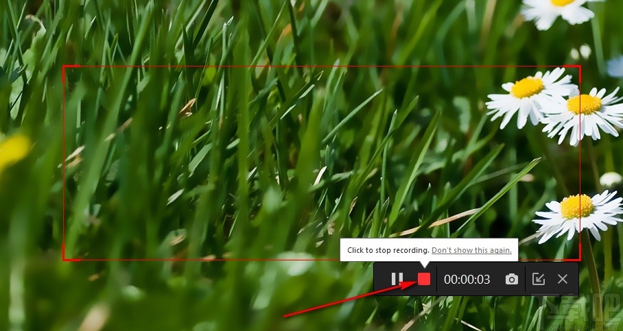 4.开始录制之后我们在录制区域的下方可以看到一些操作按钮以及显示的录制时间,点击其中的红色按钮即可停止录制。