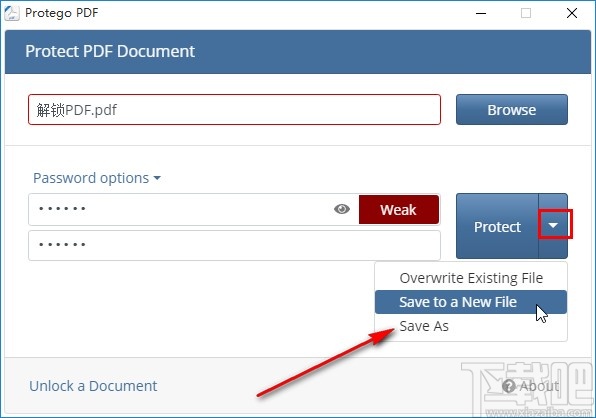 6.紧接着下一步设置好密码之后就可以点击右边的Protect按钮的三角形图标开始选择想要保存加密文件的方式了,可以选择保存为新的文件或者直接保存原文件。