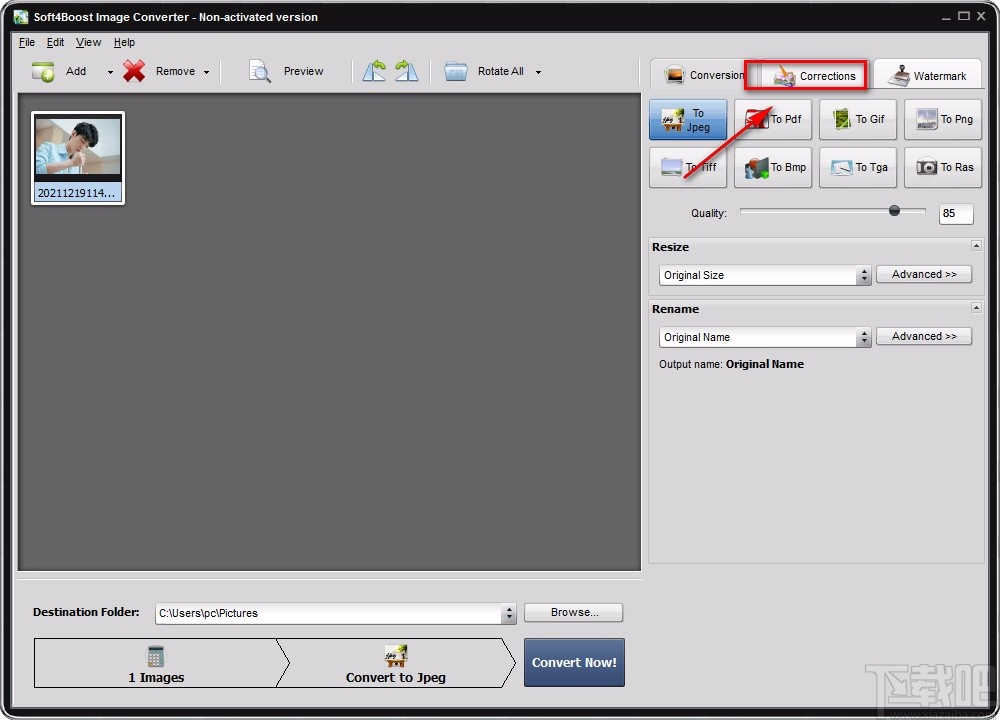 3.将图片添加到软件后,我们在界面右上方找到“Corrections”选项,点击该选项再进行下一步操作。