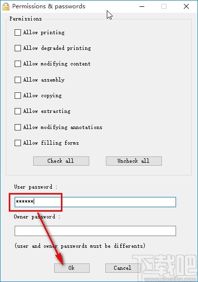 6.如果用户想要设置这两种密码的话是可以同时设置的,选择好想要限制的PDF权限之后输入两个密码,点击下方的OK按钮保存即可。