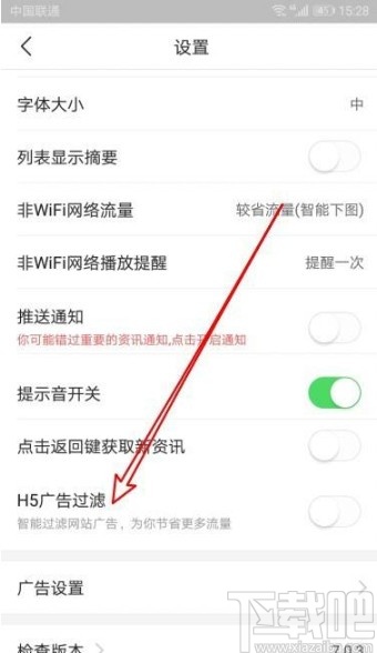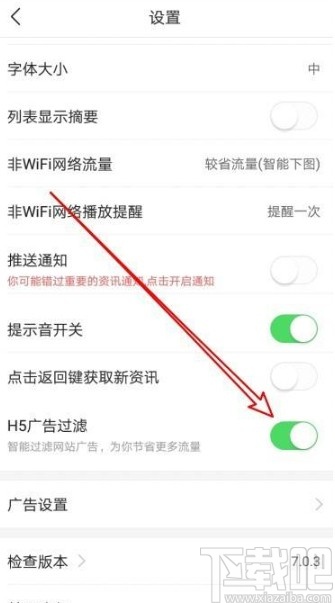 4.进入到应用的系统设置界面之后我们就可以看到有“H5广告过滤”这个选项了,找到这个选项之后点击它右边的开关打开这个功能。