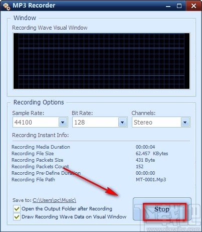 6.电脑声音录制完毕后,我们在界面右下角找到“Stop”按钮,点击该按钮就可以停止录音。