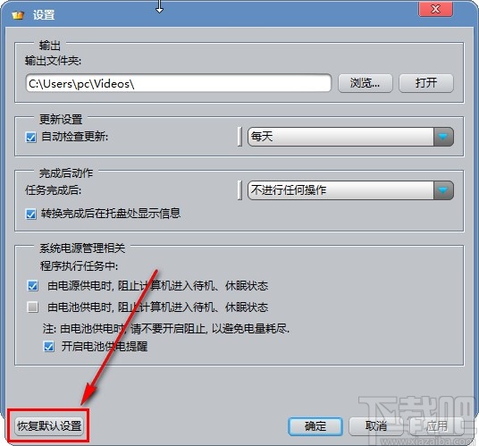 3.点击进入到软件的设置界面之后,我们在界面的左下角找到恢复默认设置这个选项,点击就可以执行恢复默认设置的操作。