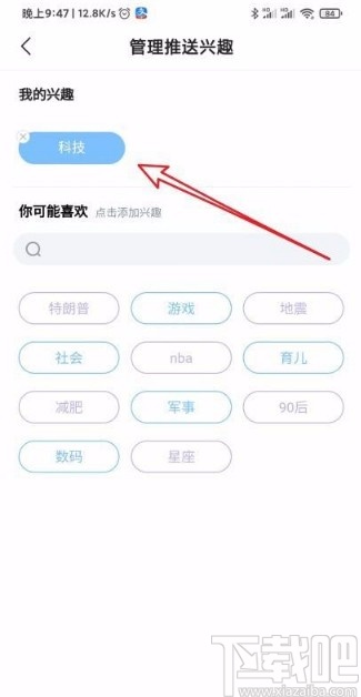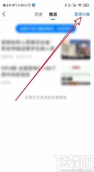 5.随后就会进入到推送页面,我们在页面右上角找到“管理兴趣”选项,点击该选项就能进入到管理推送兴趣页面。