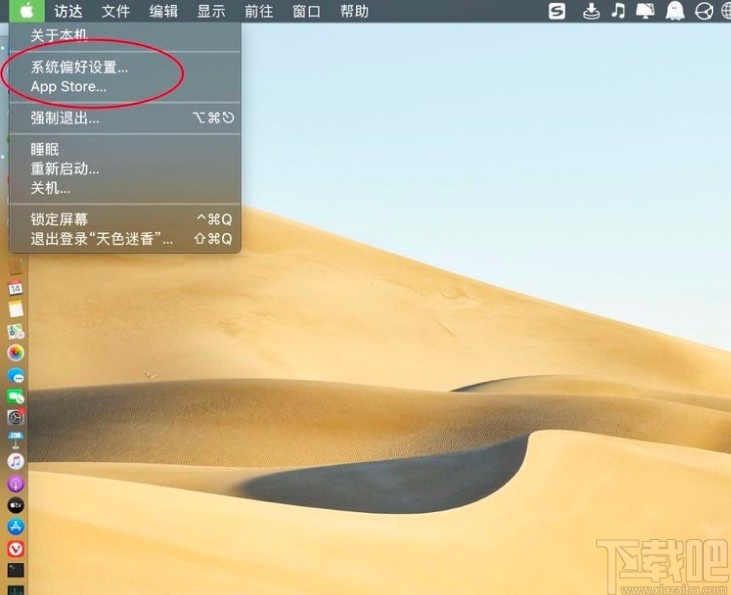 2.在下拉框中可以看到很多的操作选项,我们在这些选项中找到“系统偏好设置”选项并点击就可以了。