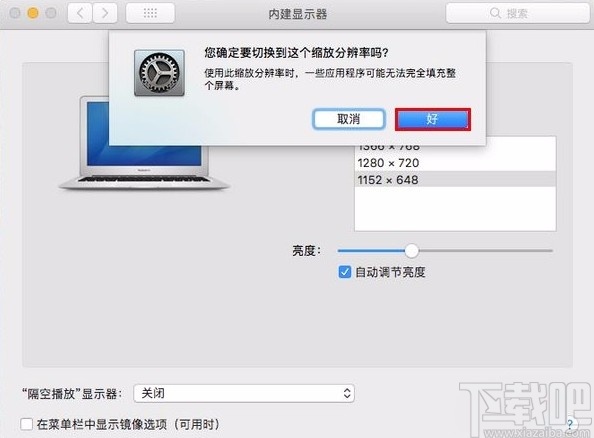 5.如果我们选择的分辨率过低,以致于正常内容在一个屏幕内无法完整显示,这时候界面上就会出现一个提示窗口;如果执意更改,则点击窗口中的“好”按钮即可。