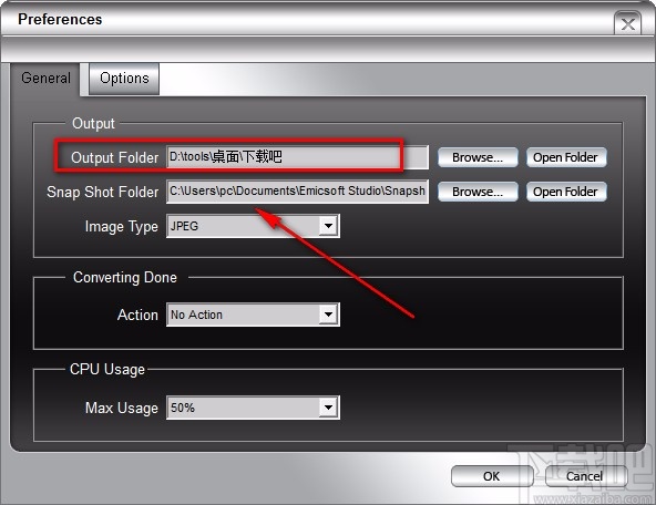 4.接下来返回到偏好设置窗口,我们在窗口中再次找到“Output Folder”选项,它后面的文本框中显示的就是刚刚设置的保存位置了。