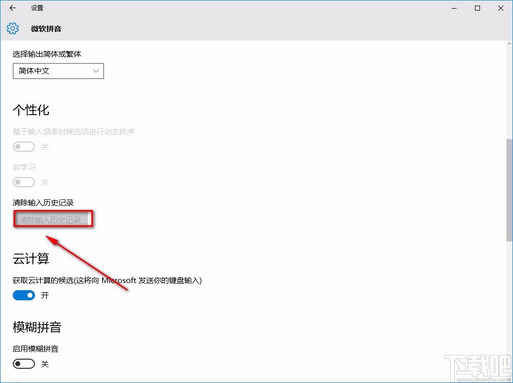 7.最后就会进入到微软拼音页面,我们在页面上找到“清除输入历史记录”按钮,点击它就可以成功清除输入历史记录了。