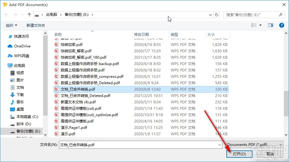 2.点击这个添加按钮之后,接下来打开一个选择文件的界面,在这个界面中我们找到目标PDF文件选中之后点击右下角的打开按钮。
