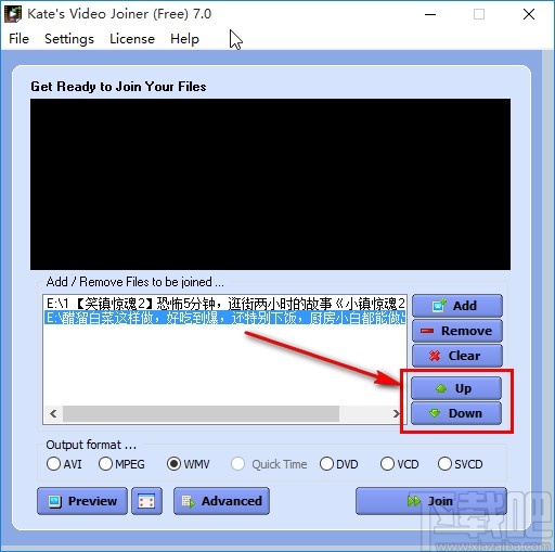 3.点击右下角的这个打开按钮成功将文件添加到软件界面,接着下一步我们选中视频,点击右边的Up、Down这个按钮,点击之后即可调整视频合并的顺序。