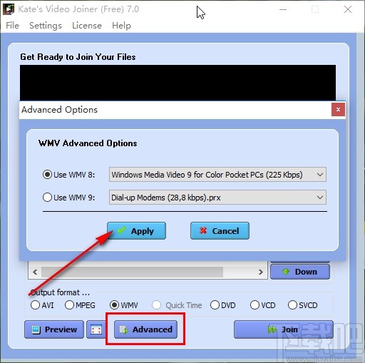 5.选择好合并的视频输出格式之后,在界面的下方找到Advanced这个选项,找到之后点击打开视频相关的参数设置界面,如下图中所示,可以点击参数的下拉列表进行选择。