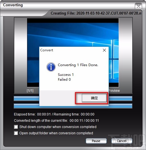 9.视频剪切结束后,界面上会出现一个转换完成的提示窗口,我们直接点击窗口右下角的“确定”按钮,即可完成全部的操作步骤。