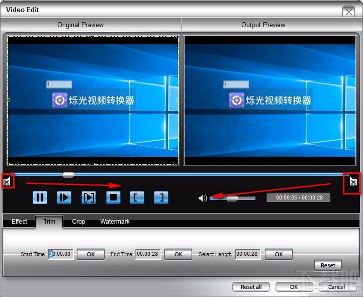 4.然后在视频编辑窗口中,我们在视频预览框的下方找到两个剪刀状按钮,将左端的箭头图标向右移动到视频剪切开始的位置;之后将进度条右端的剪刀光标向左移动到视频剪切结束的位置。