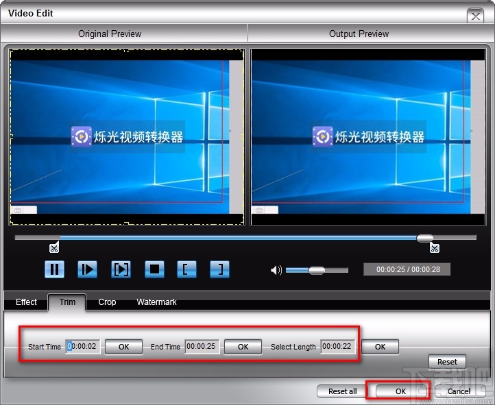 5.随后在窗口下方就可以看到视频剪切的起始时间、结束时间以及时长,如下图所示,这时候点击窗口右下角的“OK”按钮就可以返回到主界面。