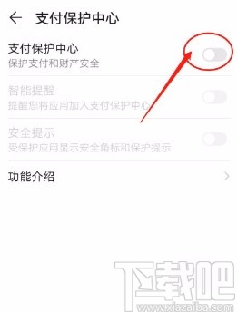 4.然后就会跳转到支付保护中心页面,我们在页面上方找到“支付保护中心”选项,该选项后面有一个开关按钮,点击该按钮将其打开。