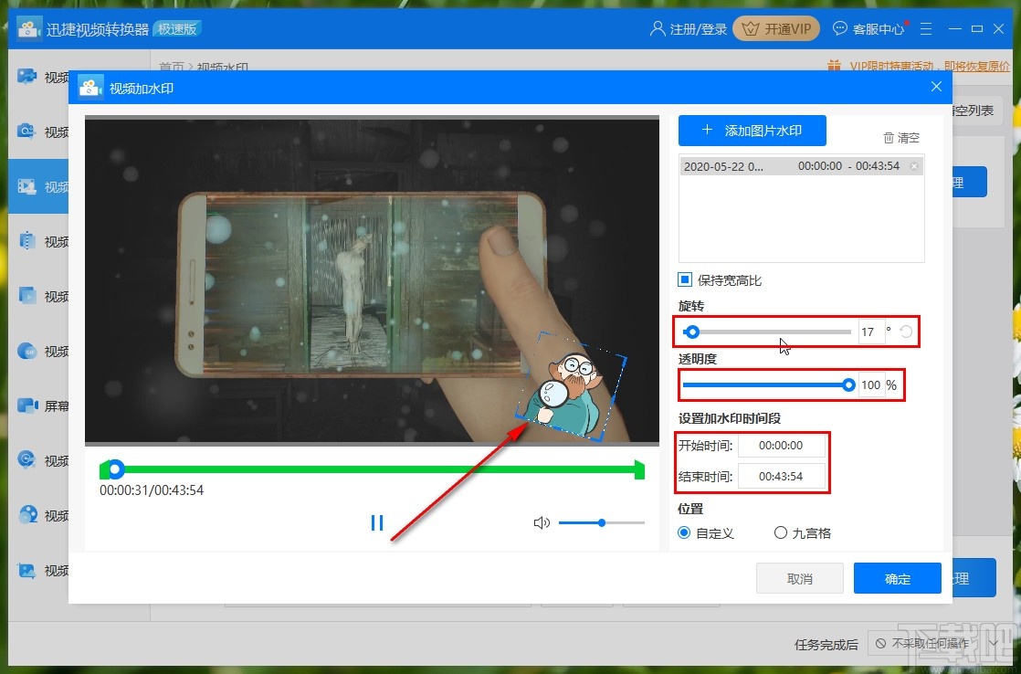 7.点击打开成功将水印添加到视频界面,可以预览水印的内容,并且在右边有很多水印的操作选项,可以旋转、设置透明度和水印的开始时间结束时间。