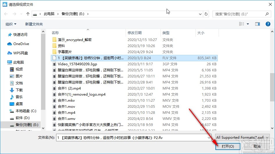 3.打开这个选择文件的界面之后,在界面中就可以选择想要处理的视频文件了,选中之后点击右下角的打开按钮。