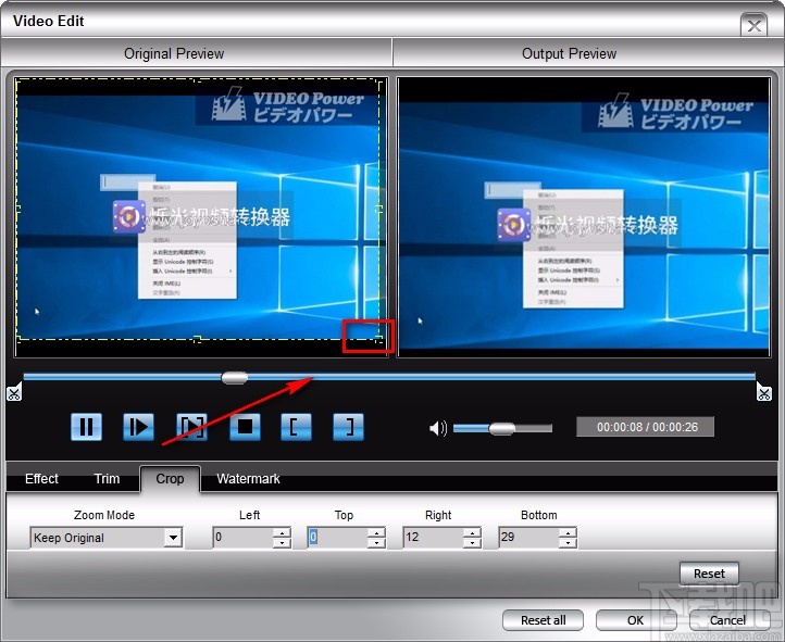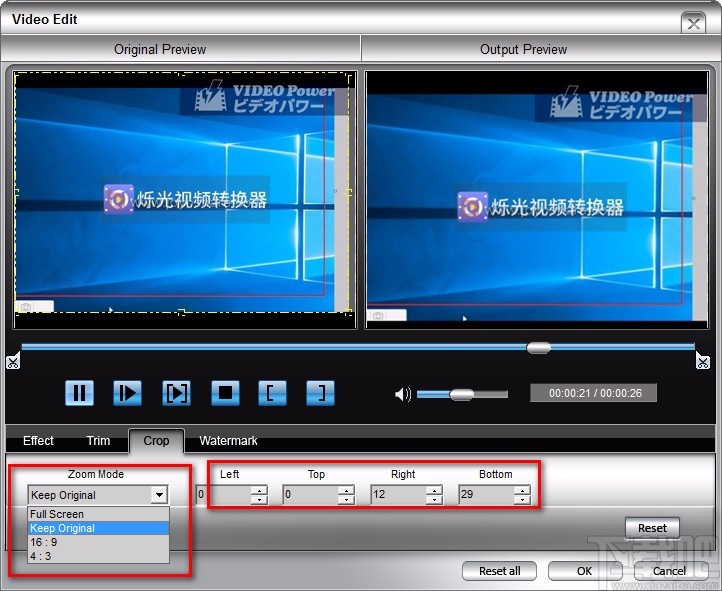 5.此外,在界面下方可以找到“Zoom Mode”选项,点击该选项下方的下拉按钮,也可以调整视频画面裁剪的尺寸比例;在“Left”、“Top”、“Right”、“Bottom”选项下方的文本框中输入对应数值,也可以达到裁剪画面的目的;之后再点击页面右下角的“OK”按钮即可。