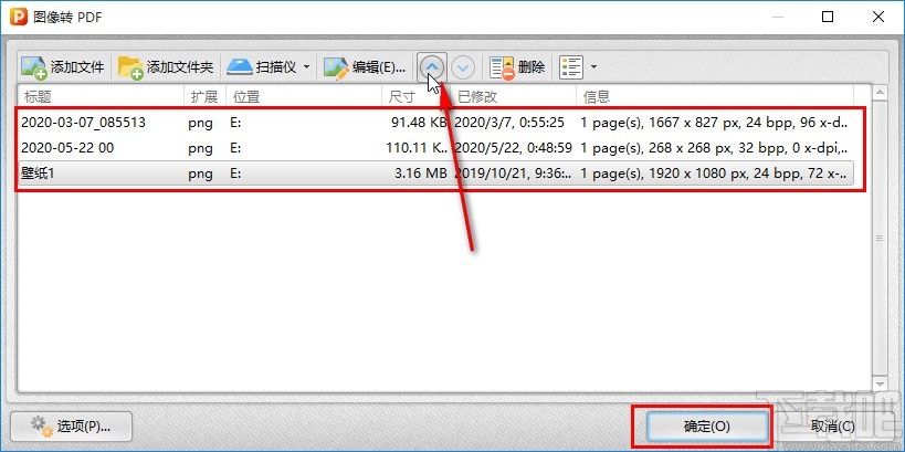 4.点击这个打开按钮之后就成功添加图片到软件界面了,可以选中其中一个图片点击上方的调整顺序按钮来调整它们的转换顺序,最后点击确定按钮确定转换。