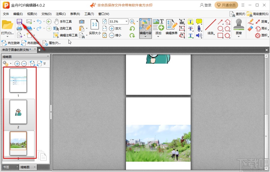 5.完成转换之后在软件中会显示转换得到的PDF文件效果,如下图中所示,左边可以预览每一个图片所在的页面,点击上方的保存按钮可以将这个PDF文件保存下来。