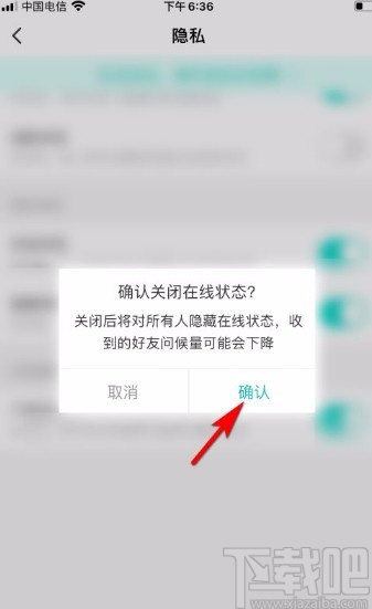6.最后界面上就会出现一个提示窗口,我们点击窗口右下角的“确认”按钮,就可以成功隐藏在线状态了。