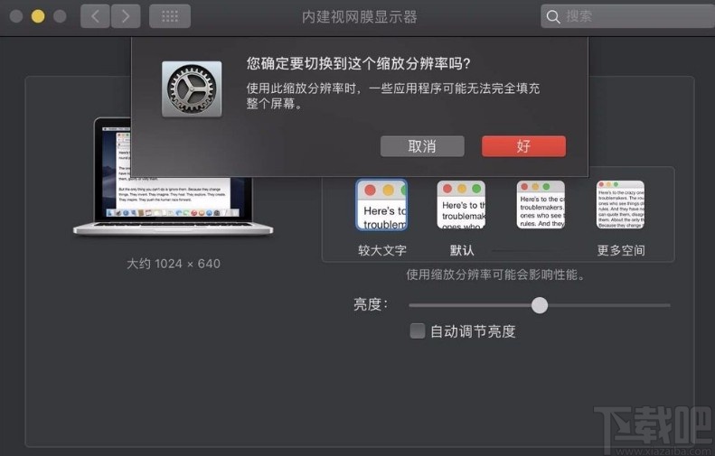 3.接着就会有一个内建视网膜显示器出现在界面上,我们在显示器中找到“分辨率”选项,点击该选项后面的“缩放”选项。