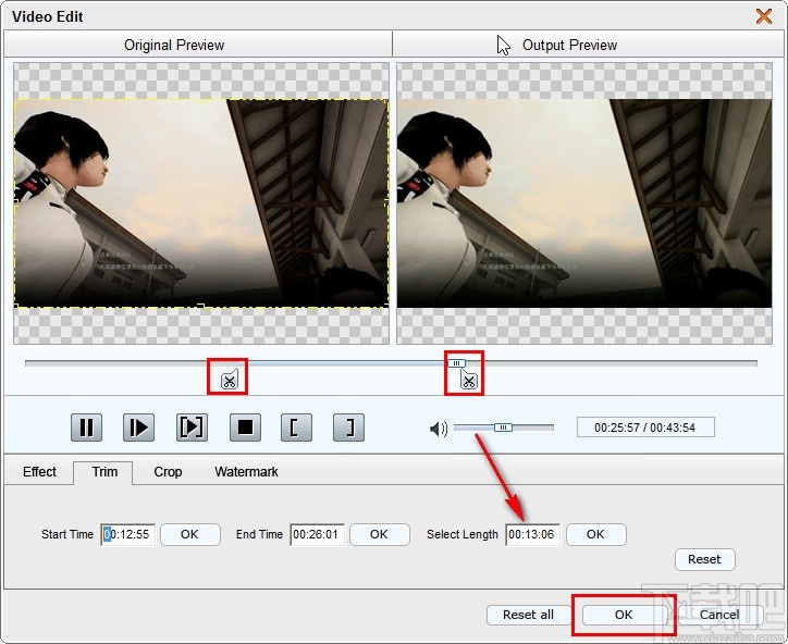 5.根据自己的需求调整好想要剪切的时间段之后,下一步在界面的右下角就可以看到有选取的时间长度了,点击OK按钮确认剪切视频。