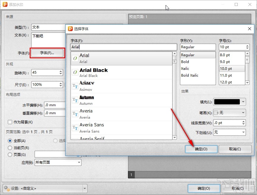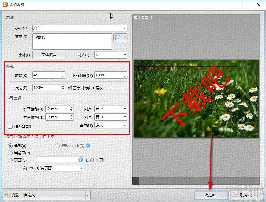 6.根据自己的需求设置好水印字体参数之后,接下来可以在左边对水印的位置参数和布局、页面范围等进行自定义设置,设置之后在右边预览水印效果,点击下方的确定按钮保存操作即可。
