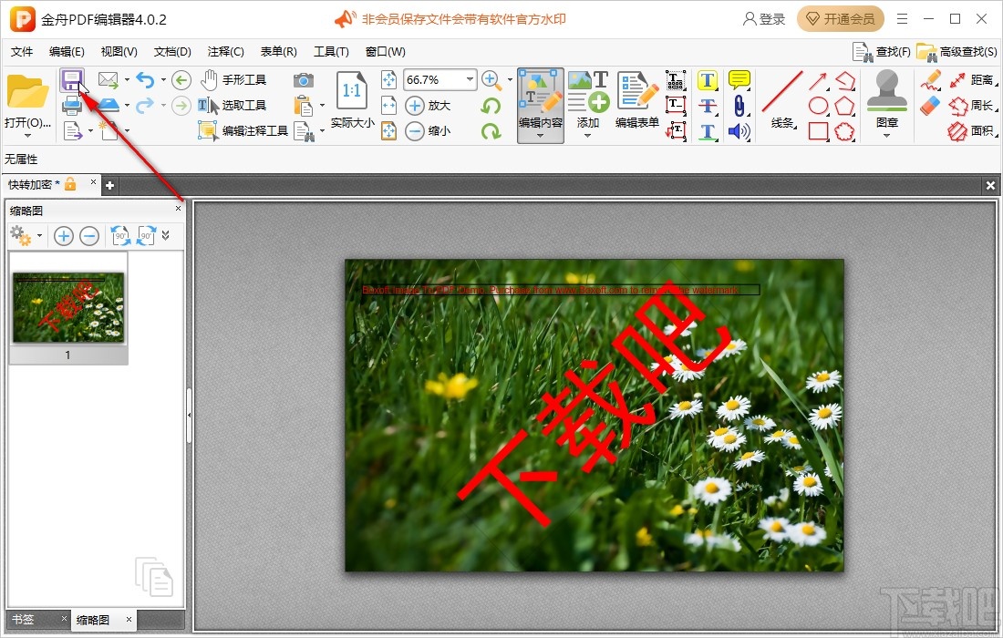 7.保存这个水印的添加操作之后,最后一步回到软件的主界面,可以看到PDF文件添加水印之后的效果,点击左上方的保存按钮将这个文件保存下来即可。