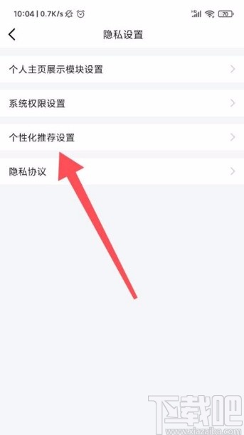 5.随后就会进入到隐私设置页面,我们在页面上找到“个性化推荐设置”选项,点击它就能切换到个性化推荐设置页面。