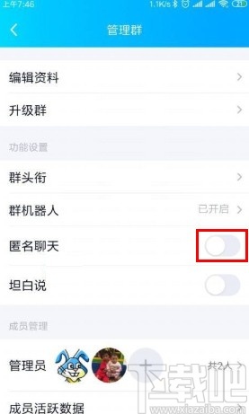 5.最后在这个管理群聊的界面中我们就可以看到有匿名聊天这个功能选项了,点击它右边的开关将这个功能打开即可。