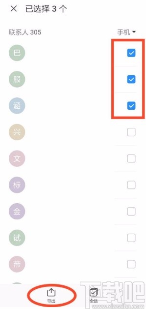 6.最后我们在页面上勾选需要导出的手机联系人,再点击界面底部的“导出”按钮,即可成功将手机联系人导出软件了。