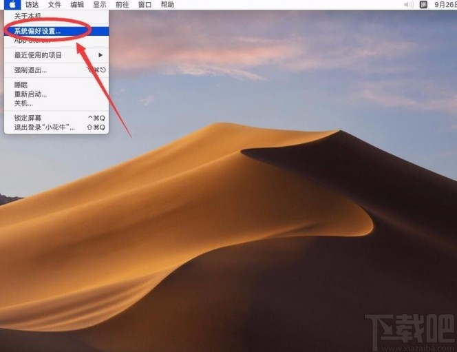3.在下拉框中可以看到很多的操作选项,我们在这些选项中找到“系统偏好设置”选项并点击即可。