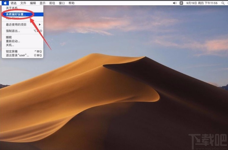 1.首先打开电脑,我们在桌面的左上角点击苹果图标按钮,其下方会出现一个下拉框,在下拉框中选择“系统偏好设置”选项。