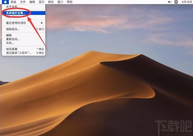 1.首先打开电脑,我们点击位于电脑桌面左上角的苹果图标按钮,其下方就会出现一个下拉框,在下拉框中选择“系统偏好设置”选项。