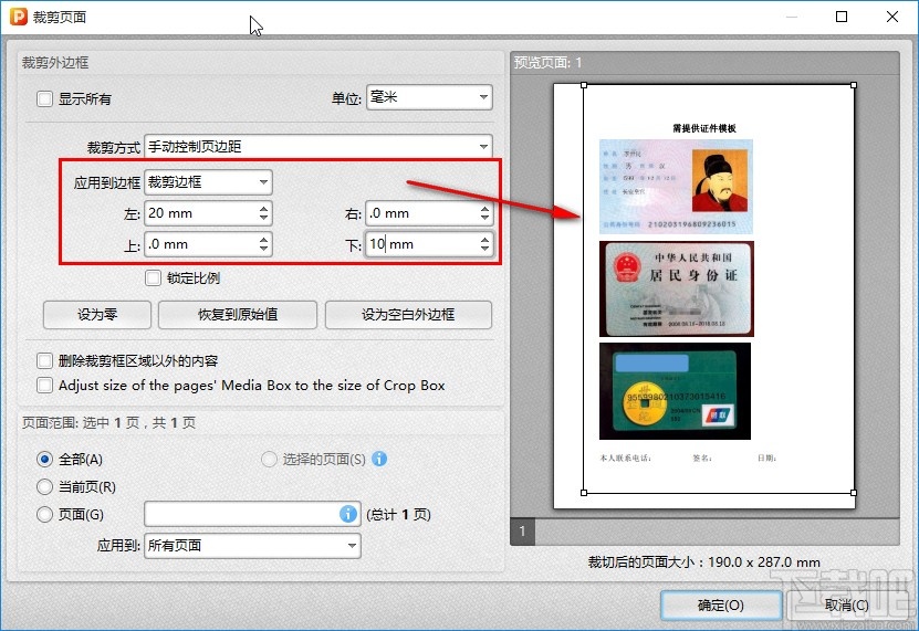 6.确认好裁剪的尺寸参数之后,下一步在页面范围位置选择好裁剪的页面范围,然后点击右下角的确定按钮确定裁剪操作。