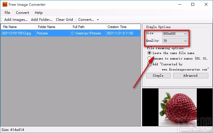3.将图片添加到软件后,我们在界面右上方找到“Size”和“Quality”选项,分别点击两个选项后面的下拉按钮,在下拉框中设置这两个参数。