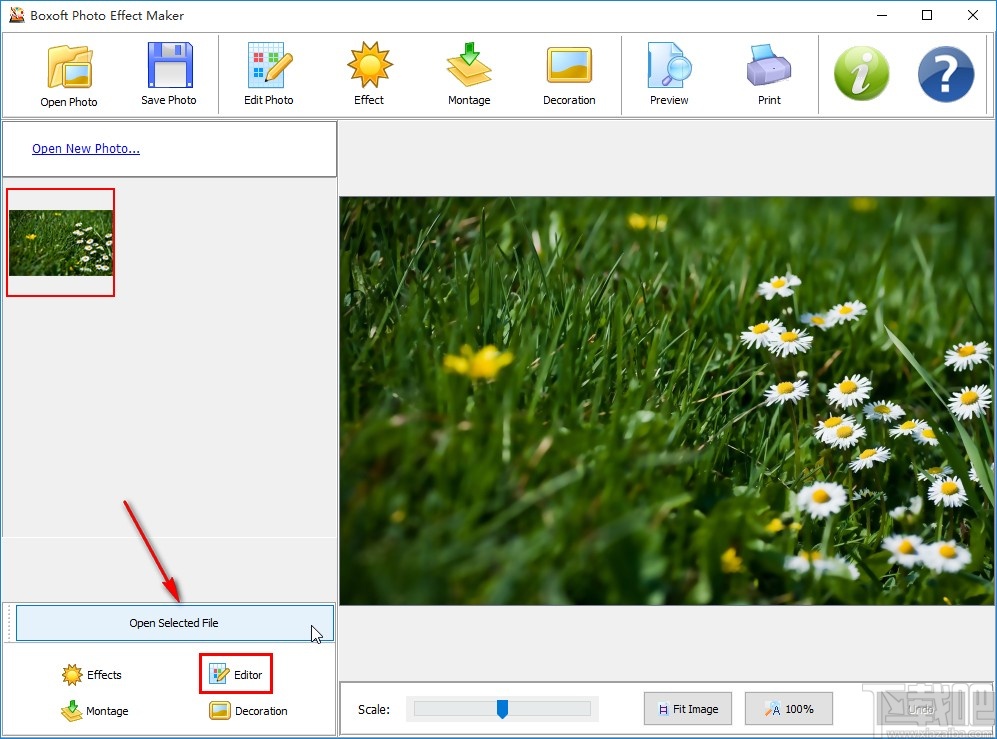 3.点击打开按钮之后我们在界面的左边找到Open Selected File这个选项,找到之后点击可以将图片添加到操作界面,然后点击Editor这个选项之后进入到其中。