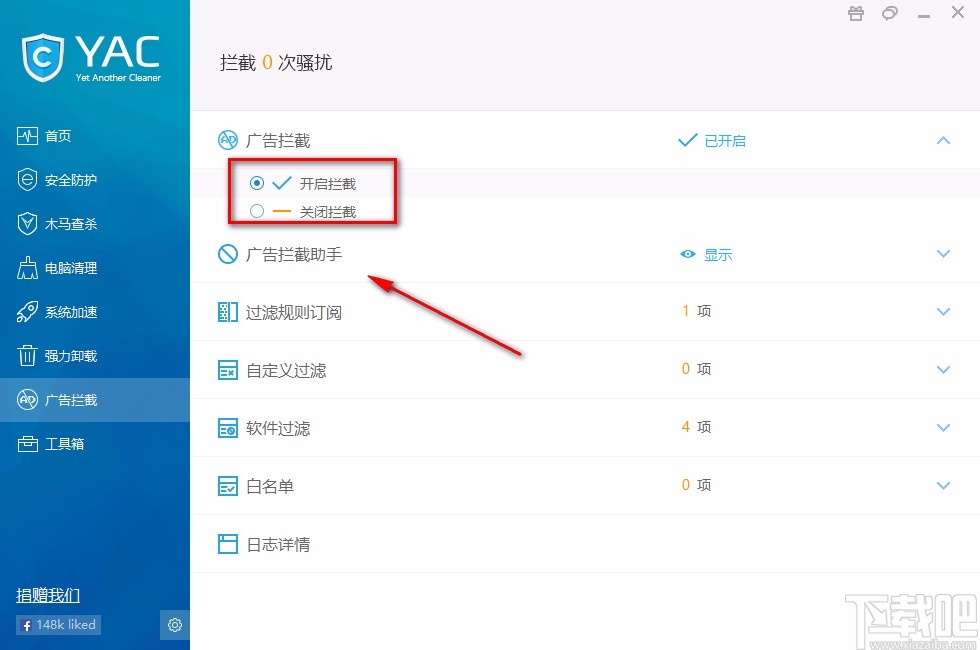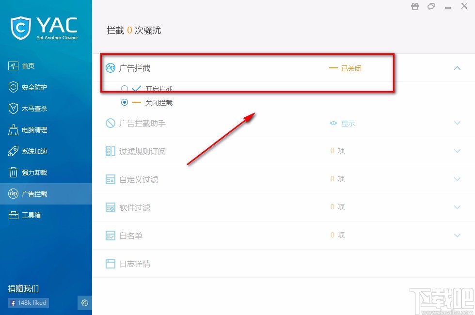 Yet Another Cleaner是一款综合型系统优化软件,这款软件拥有十分专业的系统优化功能,可以帮助用户清理电脑病毒、卸载软件、拦截广告等,是电脑装机必备的软件。我们在使用电脑的过程中,桌面上总是会弹出一些软件的广告弹窗,而且广告内容也不健康,这会极大的影响我们操作电脑的心情。为了解决以上问题,我们可以使用这款软件拦截广告。那么接下来小编就给大家详细介绍一下Yet Another Cleaner开启广告拦截的具体操作方法,有需要的朋友可以看一看并收藏起来。