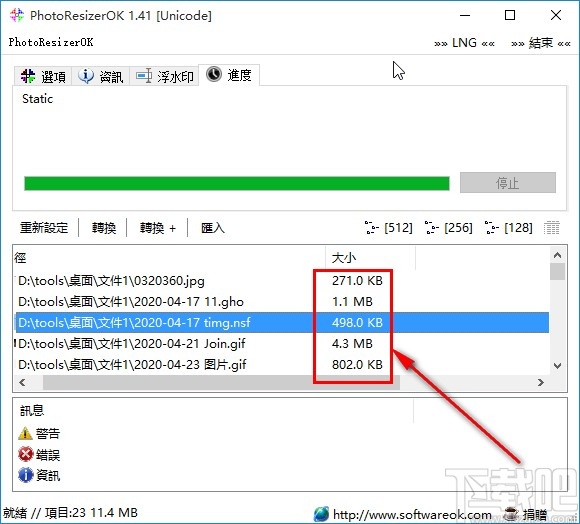 8.点击这个确定按钮之后就会自动开始压缩选择的文件夹中的图片了,等待压缩完之后会打开软件界面,可以看到文件压缩之后的大小,如下图中所示。
