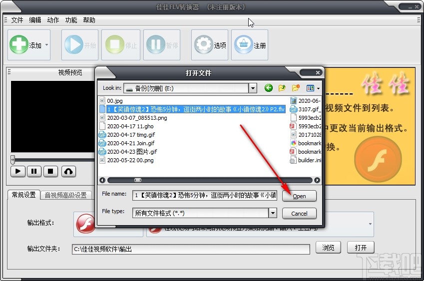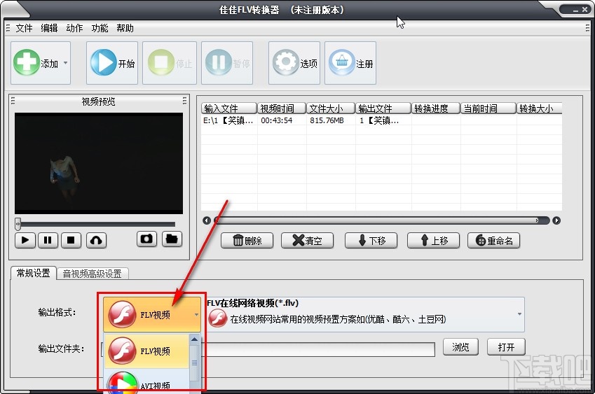 3.点击这个Open按钮之后我们就成功添加视频到软件了,然后下一步点击输出格式的视频类别下拉列表,选择其中的flv视频这个选项。