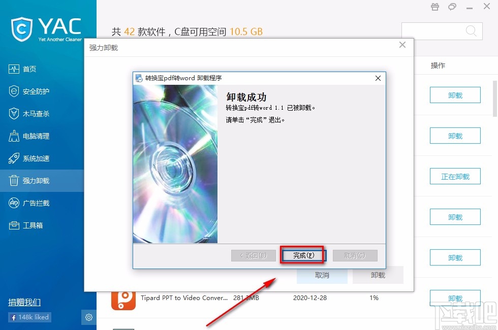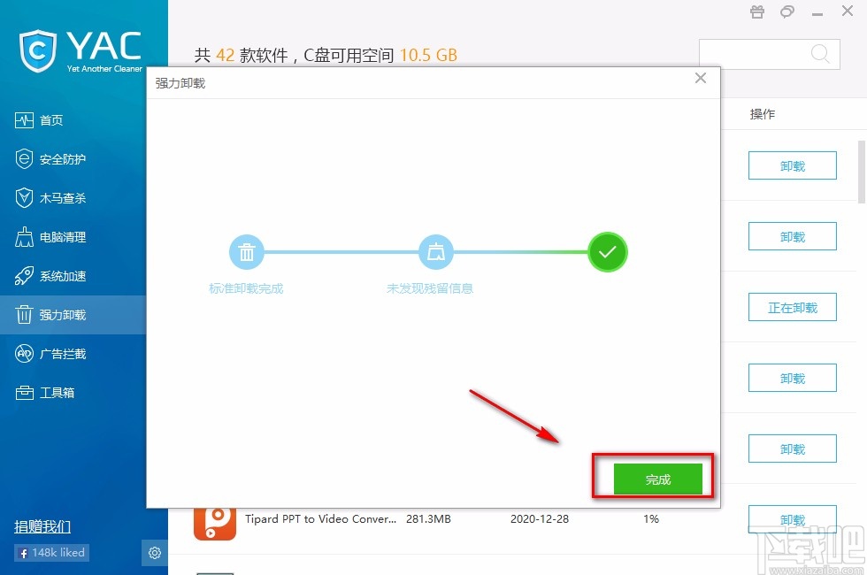 6.完成以上所有步骤后,我们还能在界面上查看到一个强力卸载窗口,我们直接点击窗口右下角的“完成”按钮就可以了。