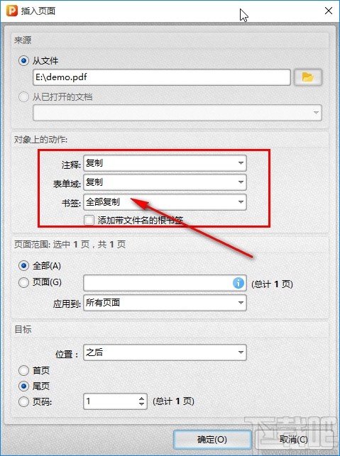 7.设置好文档元素的处理之后,下一步找到页面范围这个选项,选择想要插入的PDF文件页面范围,选择页面这个选项的话需要在右边输入目标页面页码。