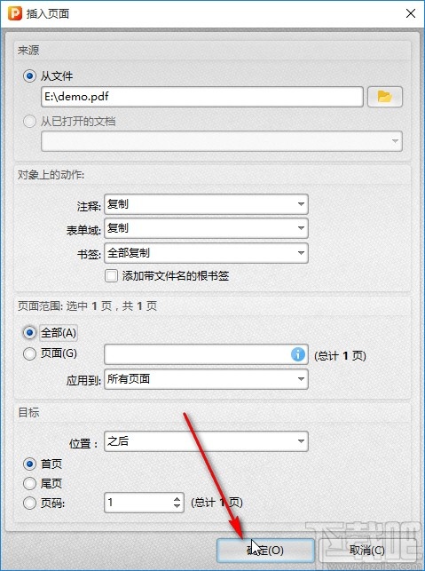 8.最后设置好插入的页面之后,在这个界面点击确定按钮即可确定插入选择的PDF文件的页面,如下图中所示。